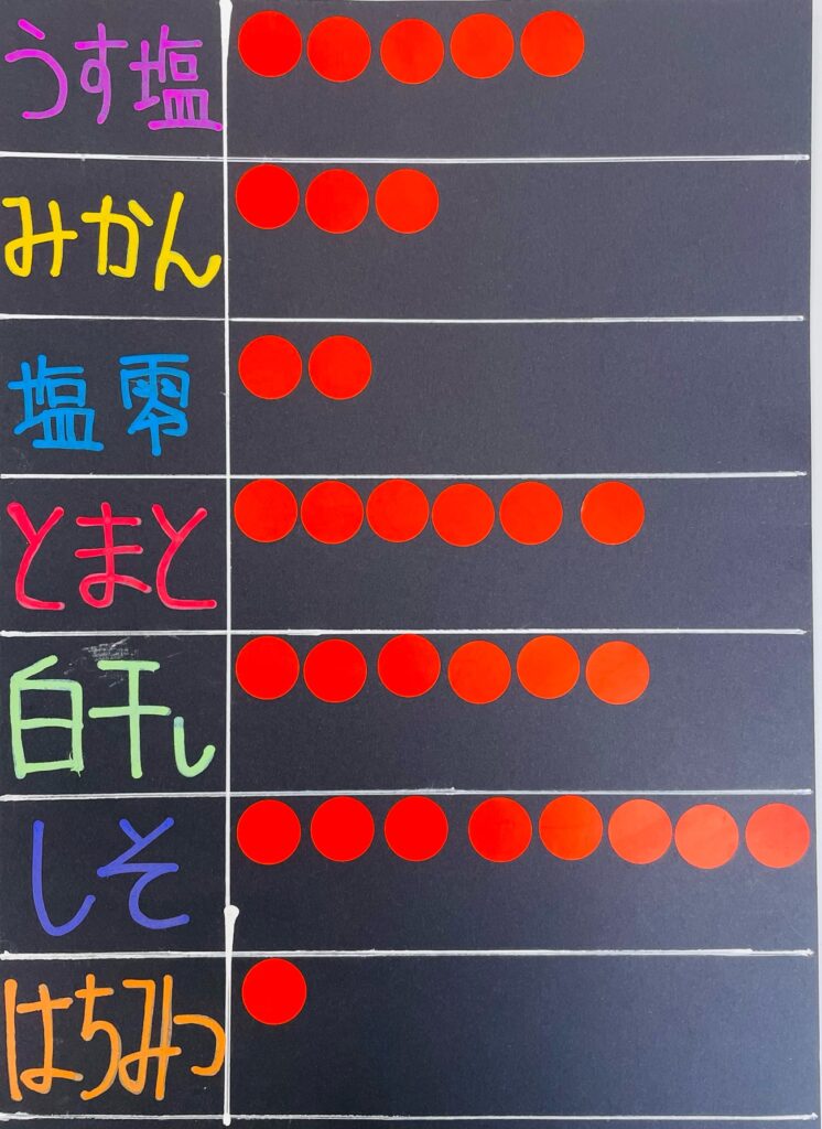 しっかり塩分濃度13%あり、その塩味と紫蘇の風味と爽やかさに、定番ではありますがやはり強かったですね!2位には「とまと梅」と、「白干梅」が同率でした。